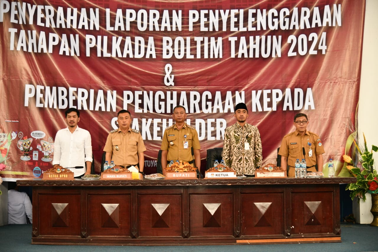 BoltimSulutkita.com–Bupati Bolaang Mongondow Timur Oskar Manoppo, SE, MM Didampingi Wakil Bupati Argo Vinsensius Sumaiku, menghadiri penyerahan laporan penyelenggaraan tahapan pilkada Boltim Tahun 2024 dan pemberian penghargaan kepada stakeholder, yang diselenggarakan oleh KPU Boltim, di Lantai III Kamtor Bupati Boltim. Senin (05/05).