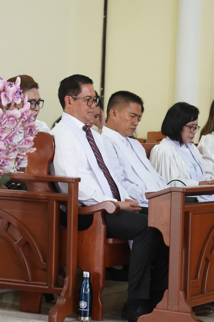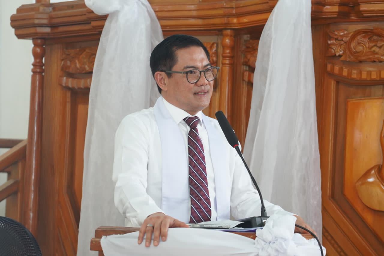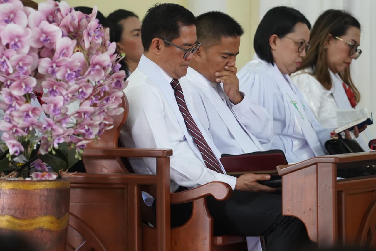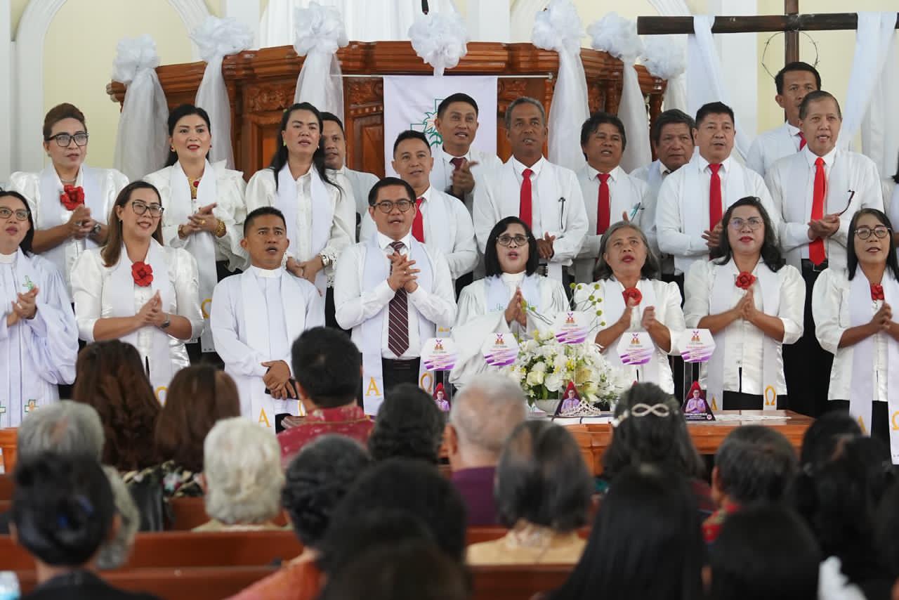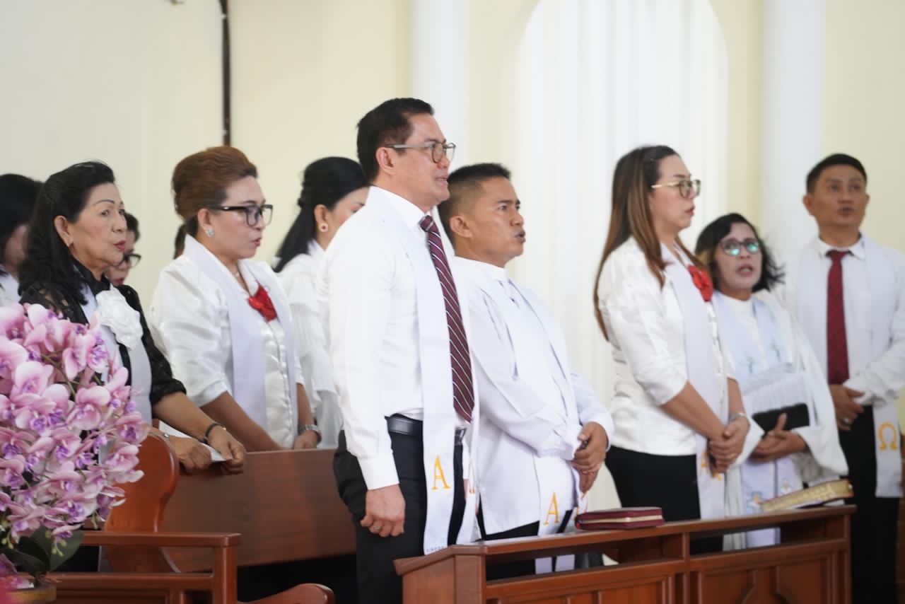Hadir mengenakan kemeja putih formal dengan stola senada, Bupati Joune Ganda yang juga menjabat sebagai Wakil Ketua BPMJ serta Ketua Komisi Pelayanan Remaja (KPR) di jemaat tersebut, tampak khusyuk mengikuti prosesi ibadah.