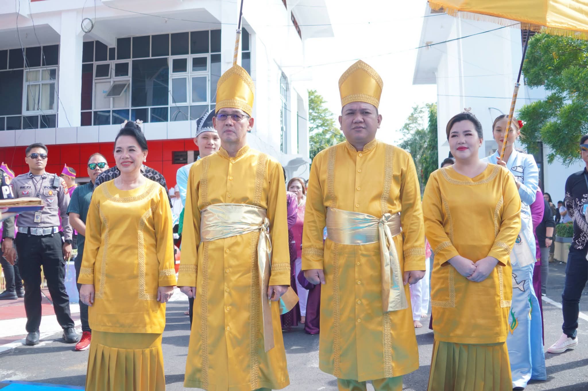 Wali Kota Bitung Hengky Honandar dan Wakil Wali Kota Randito Maringka bersama istri saat memasuki lokasi kegiatan Tulude.