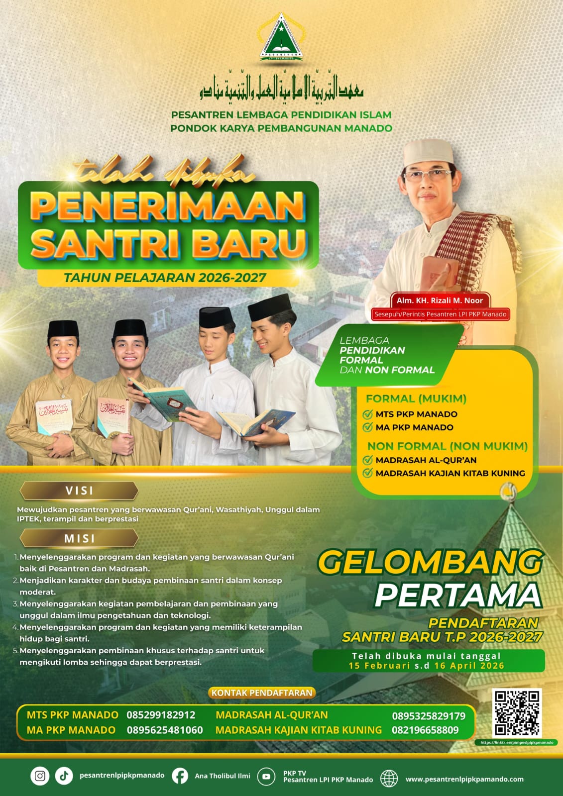 Pasalnya, Pesantren Lembaga Pendidikan Islam Pondok Karya Pembangunan Manado telah membuka penerimaan santri baru tahun ajaran 2026-2027. Oleh karena itu PKP Manado mengajak bagi para calon santri untuk segera mendaftarkan diri.