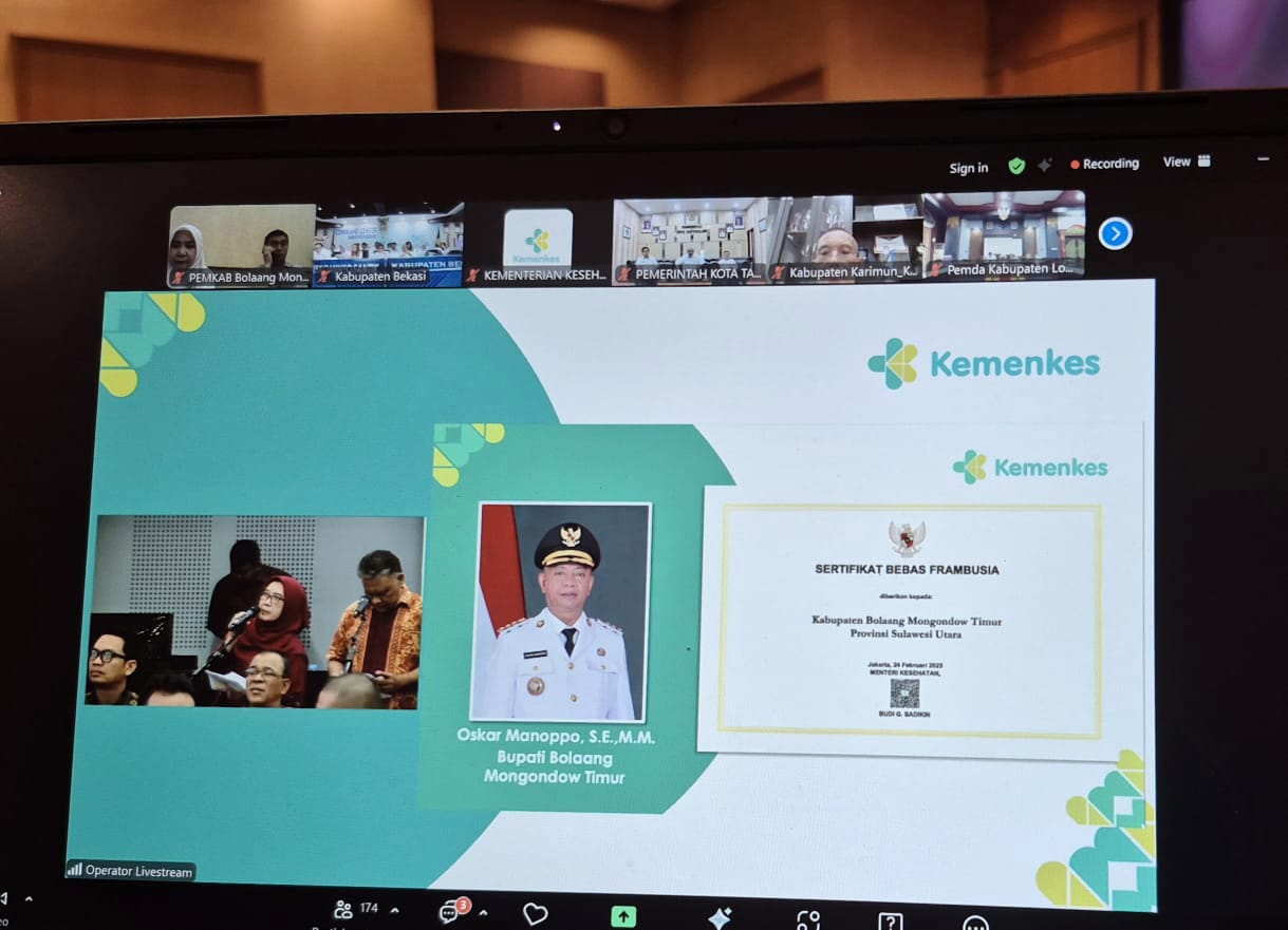BoltimSulutkita.com–Wakil Bupati Bolaang Mongondow Timur (Boltim) Argo V. Sumaiku mengikuti penyerahan sertifikat bebas Frambusia yang diselenggarakan oleh Kementerian Kesehatan (Kemenkes) Republik Indonesia (RI) melalui zoom meeting Rabu (20/8/2025) di Manado.