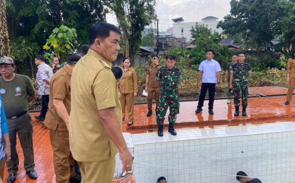 Gubernur Sulut Yulius Selvanus saat meninjau langsung proses pembersihan kolam renang KONI Sario.