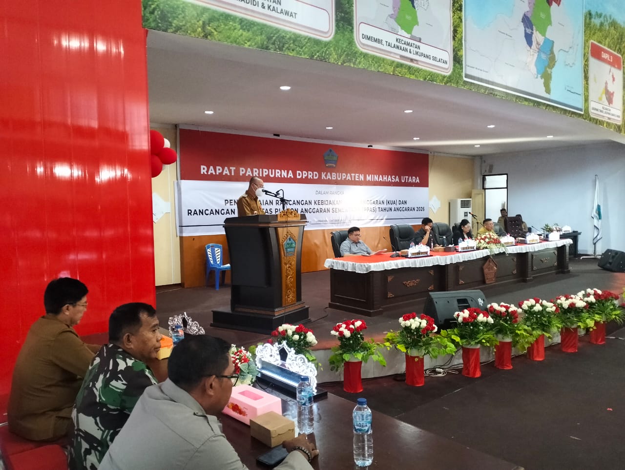 MinutSulutkita.com–Dewan Perwakilan Rakyat Daerah (DPRD) Kabupaten Minahasa Utara (Minut) menggelar rapat paripurna Penyampaian rancangan Kebijakan Umum Anggaran (KUA) dan rancangan Prioritas Plafon Anggaran Sementara (PPAS) Tahun Anggaran (TA) 2026 di Kantor Tumatenden Minut, Selasa (7/10/2025).