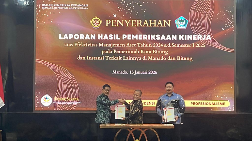 Hal ini diwujudkan saat Pemkot Bitung menerima Laporan Hasil Pemeriksaan Kinerja atas Efektivitas Pengelolaan Aset untuk periode tahun 2024 hingga Semester I Tahun 2025 yang diserahkan langsung oleh Kepala Badan Pemeriksa Keuangan (BPK) Perwakilan Sulawesi Utara (Sulut), Bombit Agus Mulyo SE MM Ak CA CSFA ERMAP GRCP GRCA, di Kantor BPK perwakilan Sulut, Manado, Selasa (13/1/2026).
