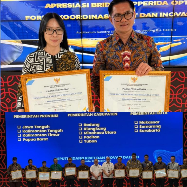 Penghargaan tersebut diserahkan Kepala BRIN Laksana Trihandoko yang diterima langsung Bupati Minahasa Utara Joune Ganda bersama daerah penerima lainnya, dalam acara Apresiasi BRIDA/BAPPERIDA Optimal 2025 berlangsung di Auditorium Sumitro Djojohadikusumo Lantai 3 Gedung B.J. Habibie KA Thamrin, Jakarta, Senin (27/10/2025).
