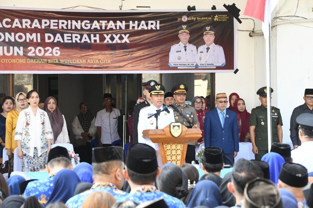 BoltimSulutkita.com–Wakil Bupati Argo V. Sumaiku, bertindak sebagai Inspektur Upacara pada peringatan Hari Otonomi Daerah (Otda) ke-XXX yang dirangkaikan dengan peringatan Hari Kartini Tahun 2026. Upacara tersebut digelar di halaman Kantor Bupati Boltim, Senin (27/04/2026).