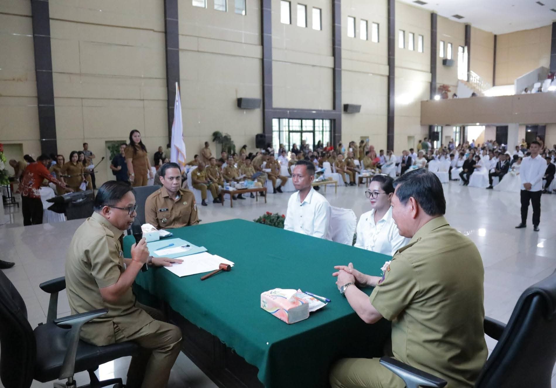KotamobaguSulutkita.com–Wakil Gubernur Sulawesi Utara, Victor Mailangkay, bersama Wali Kota Kotamobagu, Weny Gaib, jadi saksi Pencatatan Perkawinan Massal yang dilaksanakan Pemerintah Provinsi Sulawesi Utara, di Gedung Graha Bumi Beringin, Manado, Selasa 14/10/2025.